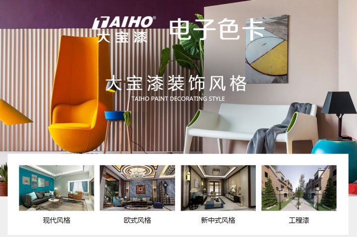 大寶漆在線配色電子色卡體驗系統,主頁風格模塊包括現代風格歐式風格新中式風格工程漆,在這里你可以根據居家戶型、裝修風格、個人喜好選擇色彩、產品,隨心組合搭配,就能立即看見“實裝效果”,全方位滿足消費者不同程度的色彩和涂裝服務需求。