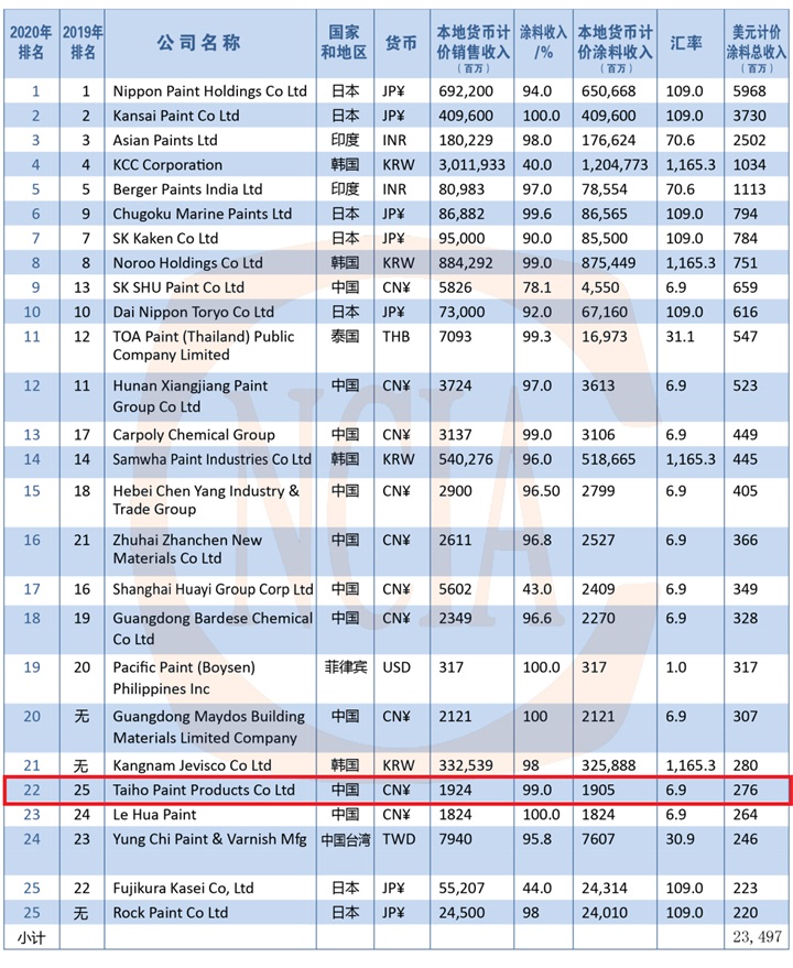 TOP 25|大寶漆再次入榜2020年亞太涂料企業25強榜單