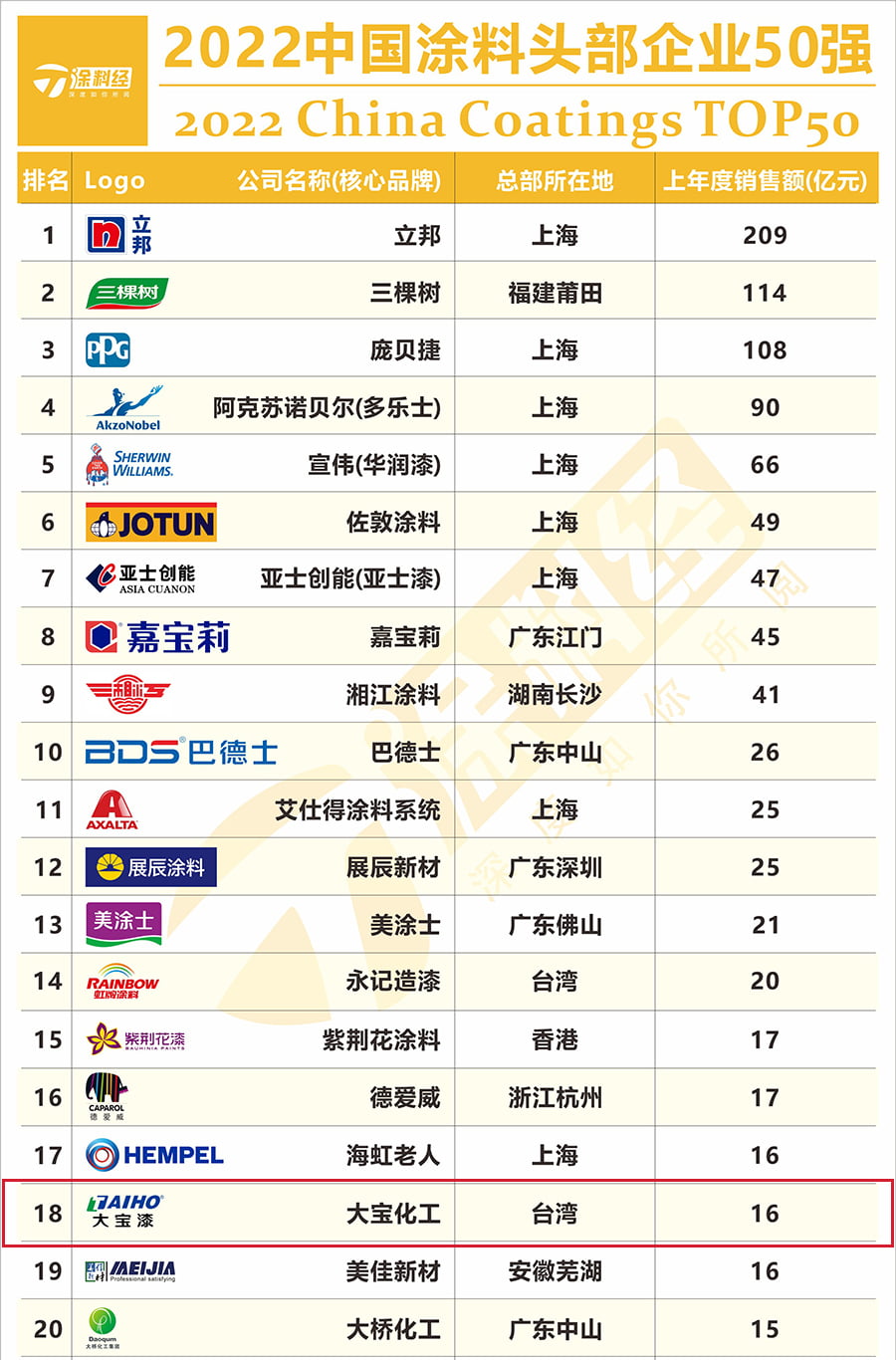 大寶漆上榜“2022中國涂料頭部企業50強”及“2022中國民族涂料50強”