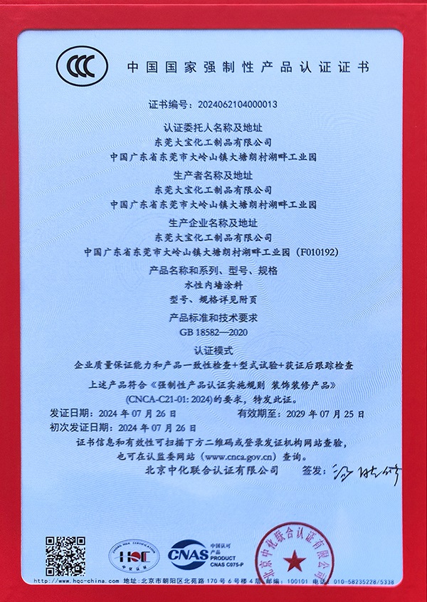 東莞大寶化工率先申請水性內(nèi)墻涂料CCC認(rèn)證,順利通過嚴(yán)格審核與評估,獲得行業(yè)首批水性內(nèi)墻涂料CCC認(rèn)證證書。