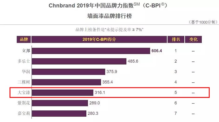 4月15日,由工信部科技司和消費(fèi)品司指導(dǎo),中國領(lǐng)先的品牌評級機(jī)構(gòu)Chnbrand推出的2019年中國品牌力指數(shù)發(fā)布。立邦、多樂士、大寶漆等知名涂料品牌再次上榜。其中,在墻面漆、木器漆的細(xì)分指標(biāo)中,大寶漆品牌都位列前五位。