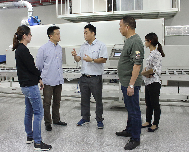到訪領(lǐng)導(dǎo)一行還參觀了東莞大寶化工現(xiàn)代化的廠房設(shè)備、智能化涂裝線、一流的中央實驗室和展示家具漆產(chǎn)品完美施工效果的色板中心等地,增進了彼此的了解和進一步合作的信心。針對“油改水”問題,工作人員向參訪人員介紹了大寶漆水性漆的工藝和質(zhì)量控制情況,詳細回答了馬總、李總一行對智能涂裝線的提問。考察人員對大寶漆先進的生產(chǎn)管理和環(huán)保理念給予了高度評價。