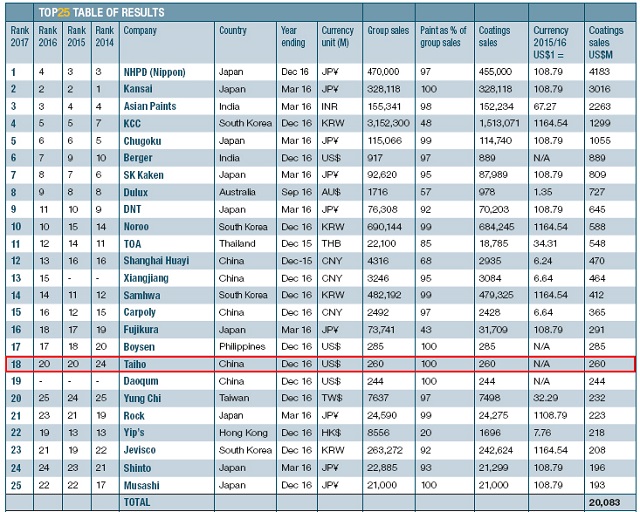 2017年亞太地區涂料企業排名前25強榜單